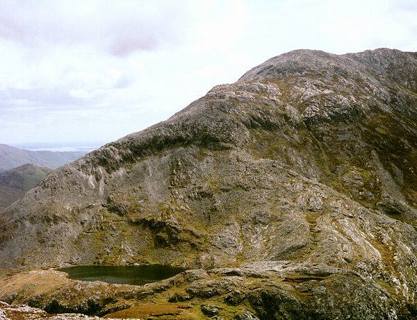 | There are crags extending along much of the left, centre and right sides of the ridge. The steepness of the ground can be inferred from the OS 1:50,000 which includes 10m contours. For further reference, view a picture of the dramatic ridge coming down to L. Mhám Ochóige that I took in 1996. The way recommended is only partly shown in this picture, being at the extreme right. | |