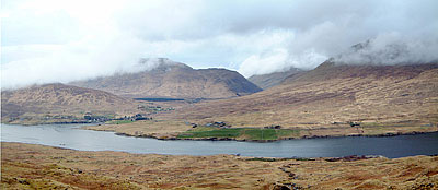 picture over some reddish bracken, finishing at Leenane Inn which is the pink building. The walk is always hard and in bad weather it can be a very serious