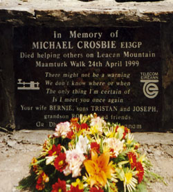 The Memorial to Michael Crosbie who died descending the last slope after assisting with radio support during the walk of 1999. |